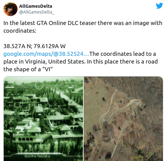 Jest też trzecia teoria z tego samego dodatku, tutaj jednak trzeba już naprawdę zapiąć pasy bo to jazda bez trzymanki pod wpływem mocniejszego towaru. Na teaserze widać fragment, w którym mamy podgląd z noktowizora i na jego dole widnieją współrzędne (od kiedy noktowizory pokazują współrzędne?). Gdy sprawdzi się je na Google Maps, trafiamy do miejsca w Virginii, gdzie znajduje się kawałek zakręconej ścieżki. Zwolennicy tej teorii twierdzą, że widzą tam rzymską cyfrę VI, która ma zwiastować kolejną część GTA...