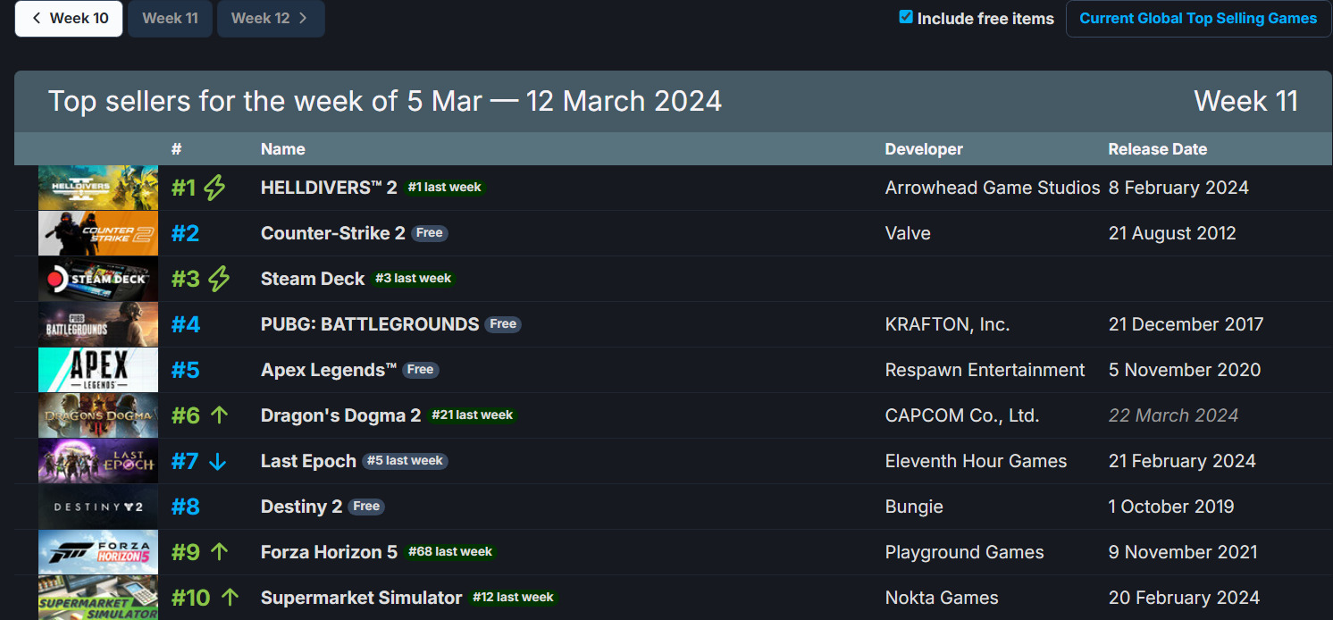 Wyniki sprzedaży na Steam między 5 a 12 marca.