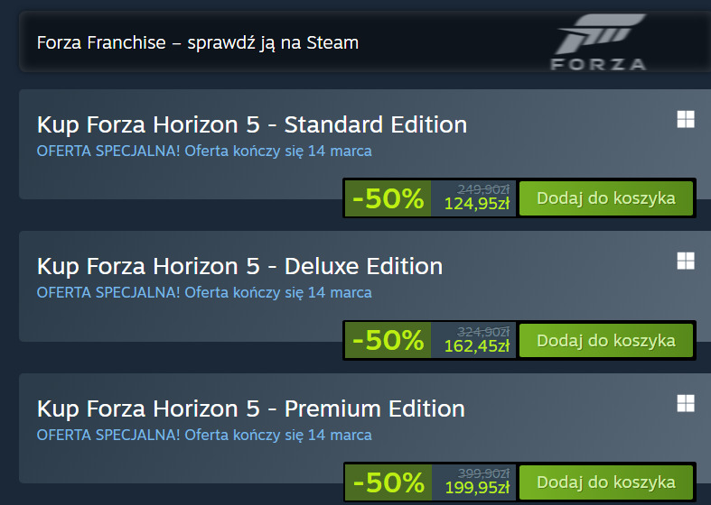 Miłym zaskoczeniem jest awans na 9 miejsce list sprzedaży Forza Horizon 5, która została przeceniona aż o 50% i kosztuje teraz 124.95zł.