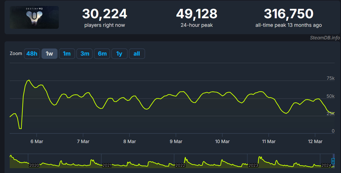 Destiny 2 również przeżywa nagły wzrost aktywności graczy od początku marca, ale nie zapominajmy, że jest to produkcja Free to Play, z ewentualnymi mikrotransakcjami.