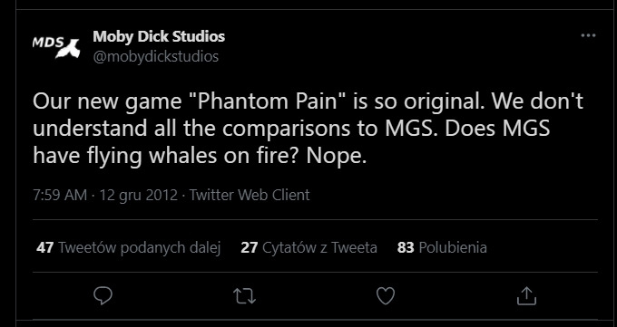 ... ale, takie samo sprostowanie dało studio Moby Dick Studios (znów ta liczba mnoga!) i Joakim Mogren w przypadku Metal Gear Solid V. Jak wiemy, Joakim też był zmyśloną postacią, a anagram jego imienia to oczywiście Kojima: