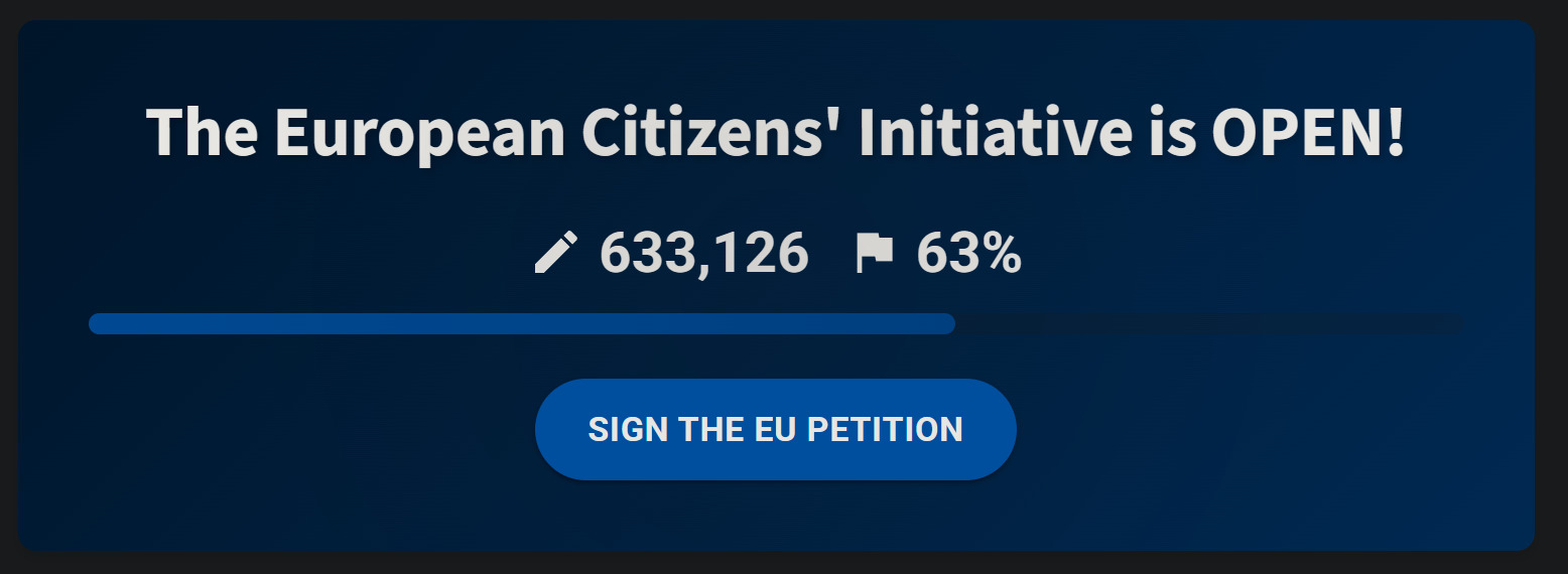 Żeby projektem zajęła się oficjalnie Komisja Europejska potrzeba okrągłego miliona podpisów. Jesteśmy już blisko, bo zebrano 633 tysiące podpisów... ale czas też nagli, bo akcja trwa jedynie do 31 lipca! Na zebranie pozostałej części mamy więc niewiele ponad miesiąc. Łapcie więc myszki i telefony w dłoń i PODPISZCIE TĄ PETYCJĘ! (głosem kolesia z Postala)