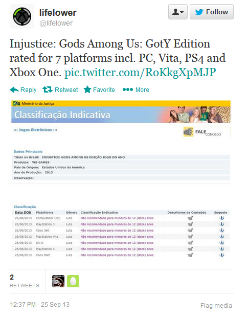 Dopiero co pisałem o handheldowej wersji Injustice: Gods Among Us, a tu na światło dzienne wypływają kolejne informacje na temat gry. Brazylijska organizacja zajmująca się przyznawaniem grom kategorii wiekowej poinformowała, że najnowsza bijatyka ze stajni NetherRealm Studios w wersji Game of the Year Edition trafi również na PS3, Xbox 360, Wii U, pecety i konsole nowej generacji. Zapewne oficjalnych wieści na ten temat możemy spodziewać się w przeciągu kilku dni.