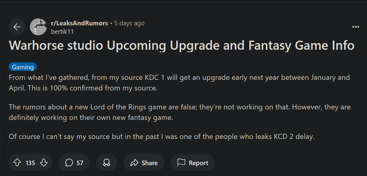 Pewnie spytacie, co nas to obchodzi? Bo na Reddit można napisać akurat wszystko. Ano ten akurat facet w przeszłości trafnie ujawnił informację o opóźnieniu Kingdom Come Deliverance 2, więc wygląda na to, że ma rzeczywiście źródło informacji bliskie tej produkcji.