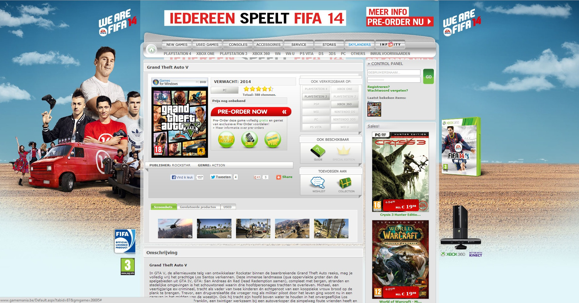 Game Mania to kolejny sklep internetowy, który umieścił w swojej ofercie GTA V w wersji na PC. Belgijski sklep zaprezentował nawet okładkę pecetowej edycji gry, oraz ustalił przybliżoną datę premiery na 2014 rok. Przypominam również, że parę dni temu na forum neoGAF pojawiły się informacje wyciągnięte z plików Xboxowej wersji GTA V, w których znaleziono wzmianki o wersjach na PC i PlayStation 4. Wszystko wskazuje więc na to, że blaszakowe GTA jest raczej pewniakiem i prędzej czy później zawita na sklepowe półki