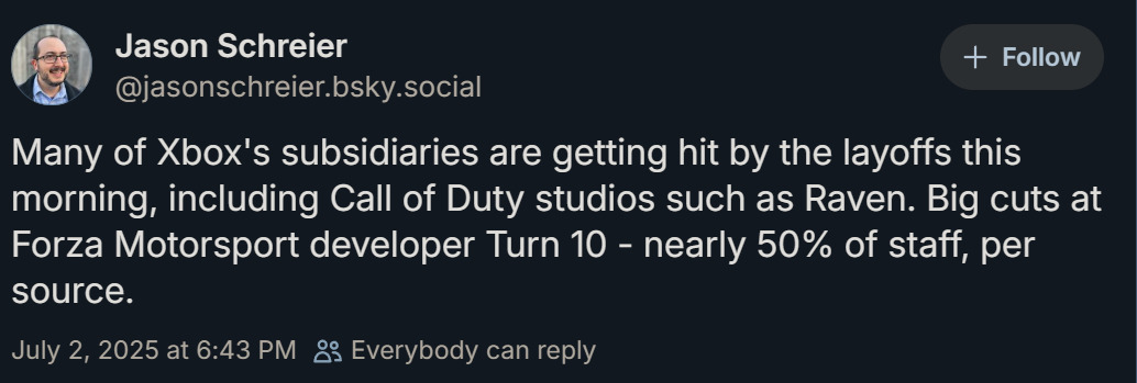 Do prawdziwej masakry miało dojść za to w biurze firmy Turn 10, czyli twórców Forzy Motorsport. Tam według Jasona Schreierra (wiarygodny dziennikarz) miało zostać zwolnionych aż 50% pracowników (!), czyli łącznie całe setki osób.