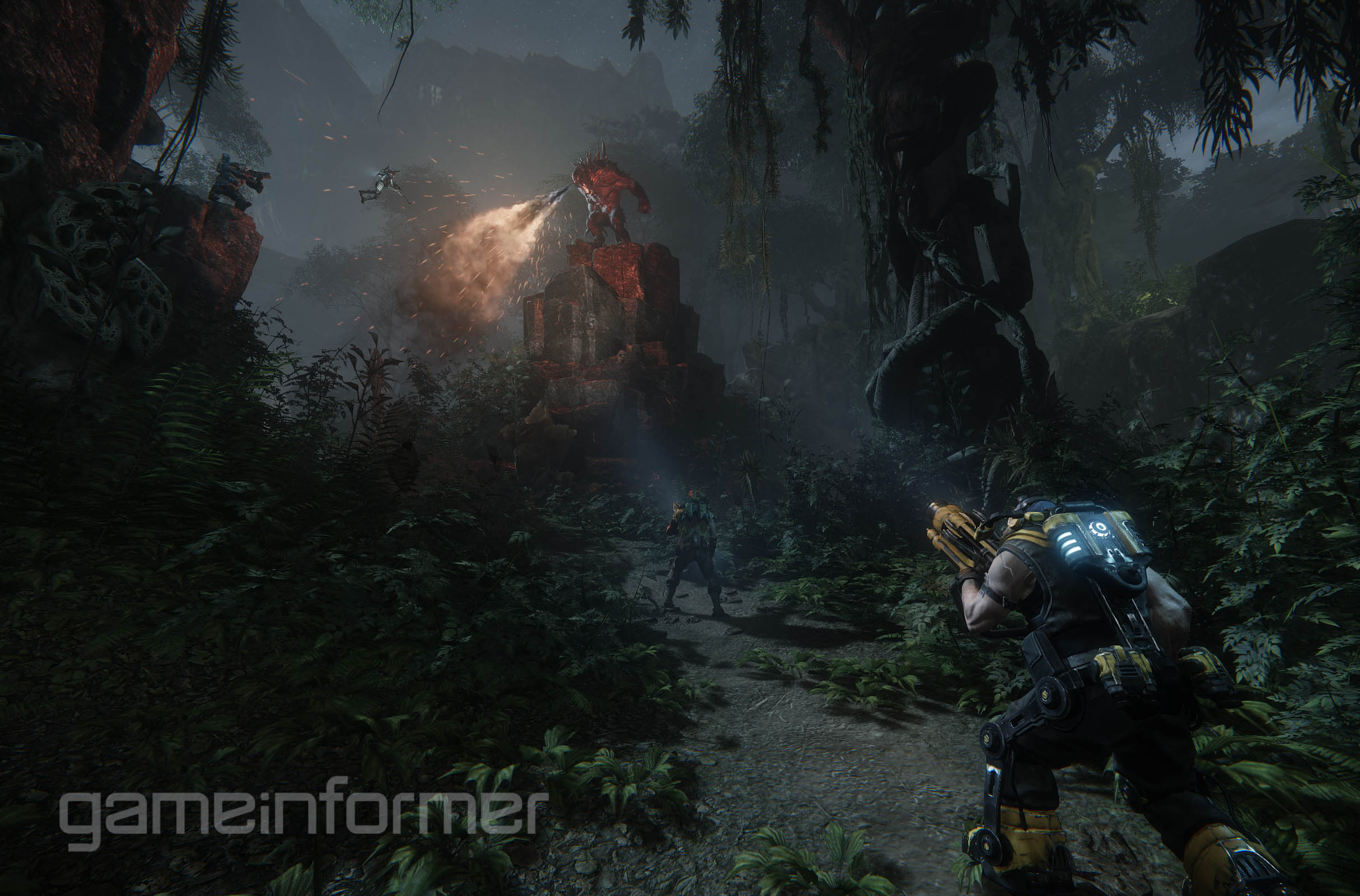 Na szczęście wspomniany wyżej magazyn dostarczył nam właśnie wysokiej jakości zdjęcia prezentujące Evolve w akcji. Na pierwszym planie znajdziecie głównych bohaterów, chociaż dla ufoków również starczyło miejsca. Nie wiem jak wy, ale ja czuje się oczarowany poniższymi zdjęciami. Zapowiada się wspaniały kawałek kodu dla fanów Left 4 Dead.
