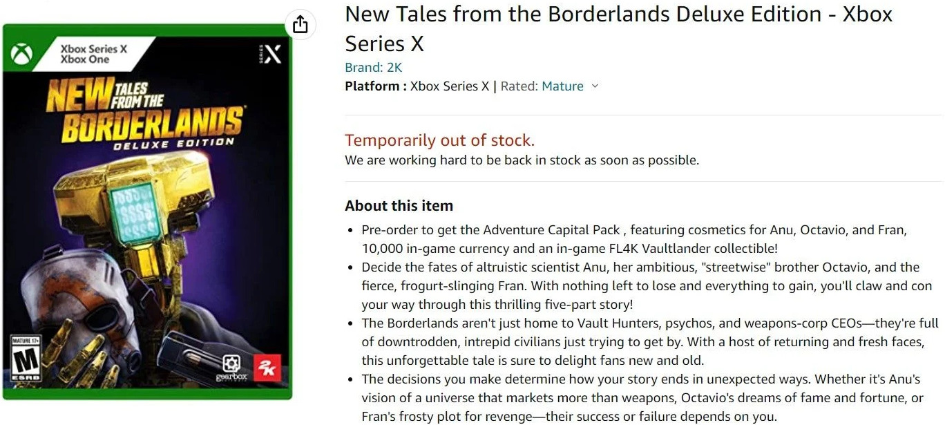 Warto tutaj nadmienić, że chociaż całość wygląda podejrzanie przez bardzo bliską datę premiery, Gearbox, właściciel marki Borderlands, potwierdził już wcześniej, że powstaje kontynuacja gry. Źródłem dzisiejszego pzecieku jest Amazon, który często przez pomyłkę wyświetla świeżo dodane do katalogu produkty, które za chwilę znikają, aż do czasu ich oficjalnego ujawnienia.