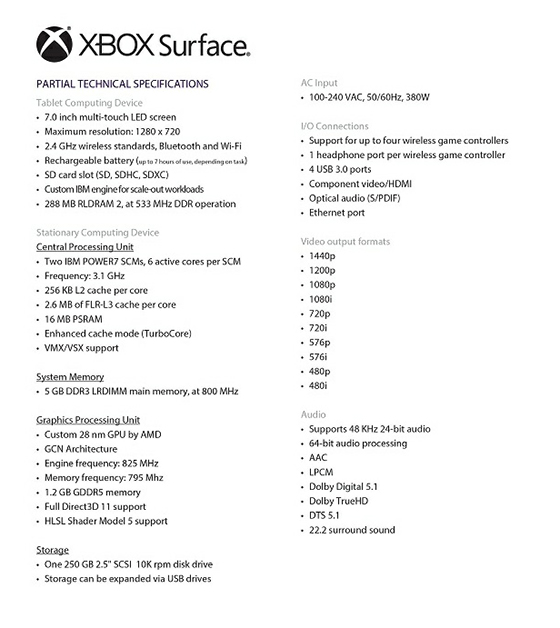 Do sieci wyciekł ostatnimi czasy niezwykle ciekawy dokument, mówiący o rzekomej specyfikacji nowego sprzętu ze stajni firmy Microsoft. Xbox Surface, bo tak miałby zostać ochrzczony nowy twór, jest prawdopodobnie stacjonarną konsolą, wzbogaconą o 7-calowy tablet, podobnie jak Wii U. Pewności w tego typu kwestiach nigdy nie ma, ale przyznajcie sami, że dokument prezentuje się wiarygodnie.