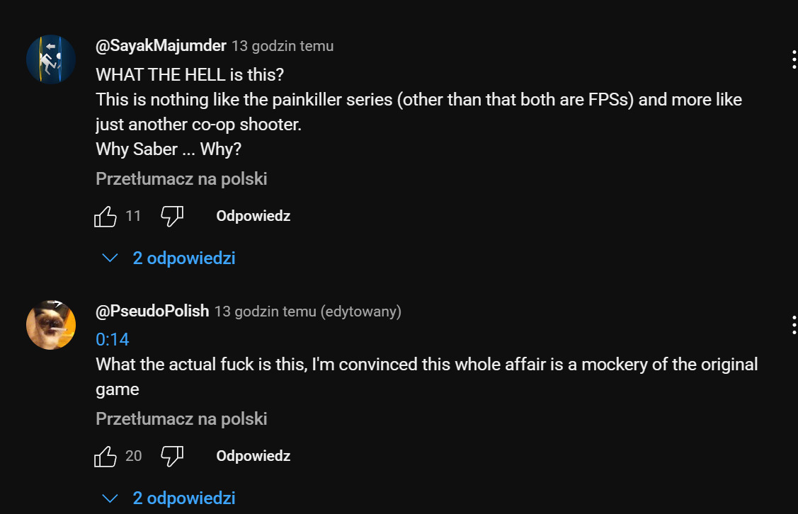 Wielu z nich pyta wprost cyt: "Co to k**** jest?" i nie szczędzi gorzkich słów pod samym filmem. Wygląda na to, że gracze oczekiwali raczej remake'u i minimalnych zmian względem oryginału, a biorąc pod uwage gameplay na filmie, wielu zwraca uwagę, że otrzymamy raczej grę w stylu Warhammer Darktide aniżeli coś co ma cokolwiek wspólnego z kultowym Painkillerem z 2004 roku.