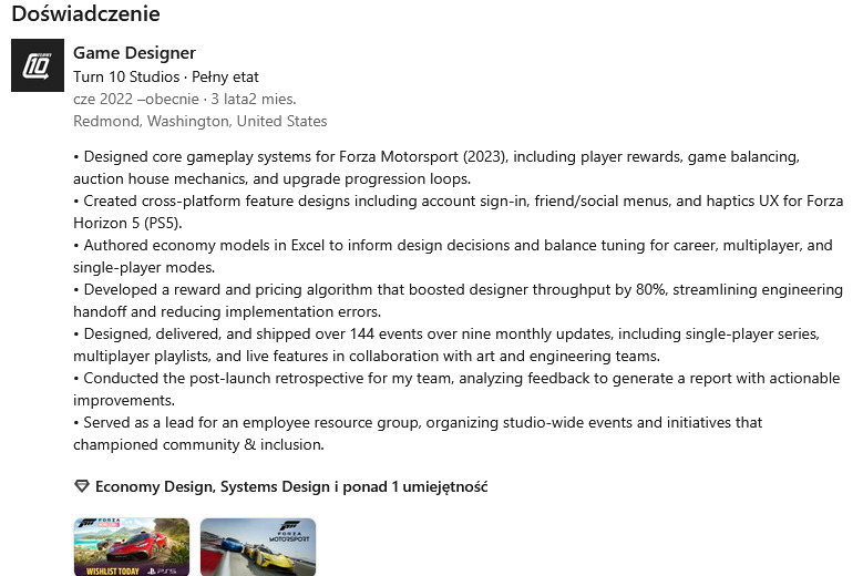 Źródłem informacji o tym imponującym osiągnięciu, jest CV byłego projektanta Turn 10 Studios, Harrisona Bolina, który został objęty niedawnymi redukcjami w studiach Microsoftu. Na jego profilu w serwisie Linkedin znalazła się krótka notka odnośnie jego pracy