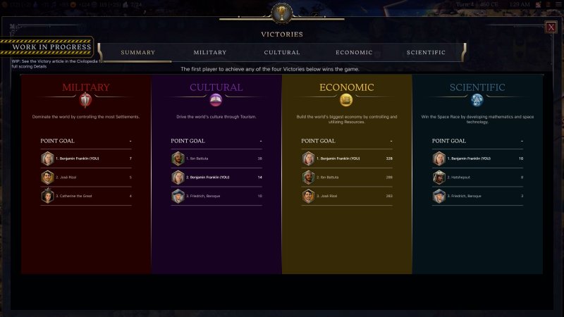 Kolejna zmiana zachodzi w systemie zwycięstw. Nowy model stawia warunki zwycięstwa w centrum rozgrywki już od najwcześniejszych etapów gry, wymagając od gracza osiągnięcia wyraźnej dominacji w jednej z czterech kategorii: Wojskowej, Ekonomicznej, Kulturowej lub Naukowej. Zamiast sztywnych wymagań związanych z dotychczasowym systemem osiągania kamieni milowych, gra zaoferuje wiele równorzędnych sposobów realizacji celu, również wewnątrz wspomnianych kategorii. Według twórców nowe podejście ma nagradzać elastyczne decyzje i oferować graczom więcej alternatywnych dróg do zwycięstwa niż było to znane wcześniej.