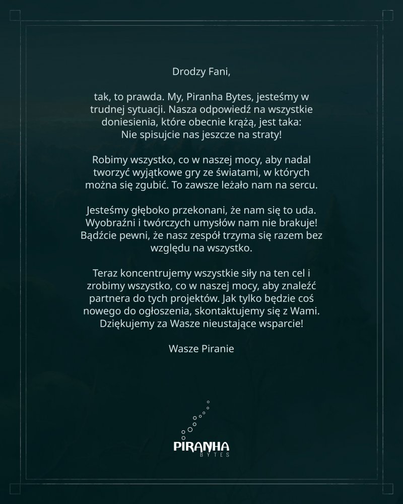Piranha Bytes, twórcy takich kultowych serii jak Gothic oraz Risen opublikowali oświadczenie, w którym potwierdzają istniejące problemy. Zespół robi wszystko, co w ich mocy, aby znaleźć nowego partnera, który pomoże tworzyć kolejne, uwielbiane przez fanów produkcje. Nie otrzymaliśmy oficjalnego oświadczenia dotyczącego losu marek tworzonych przez studio. Biorąc jednak pod uwagę, że remake pierwszej części Gothica jest tworzony przez inne studio, to prawdopodobnie marka wciąż zostanie z Embracer Group.