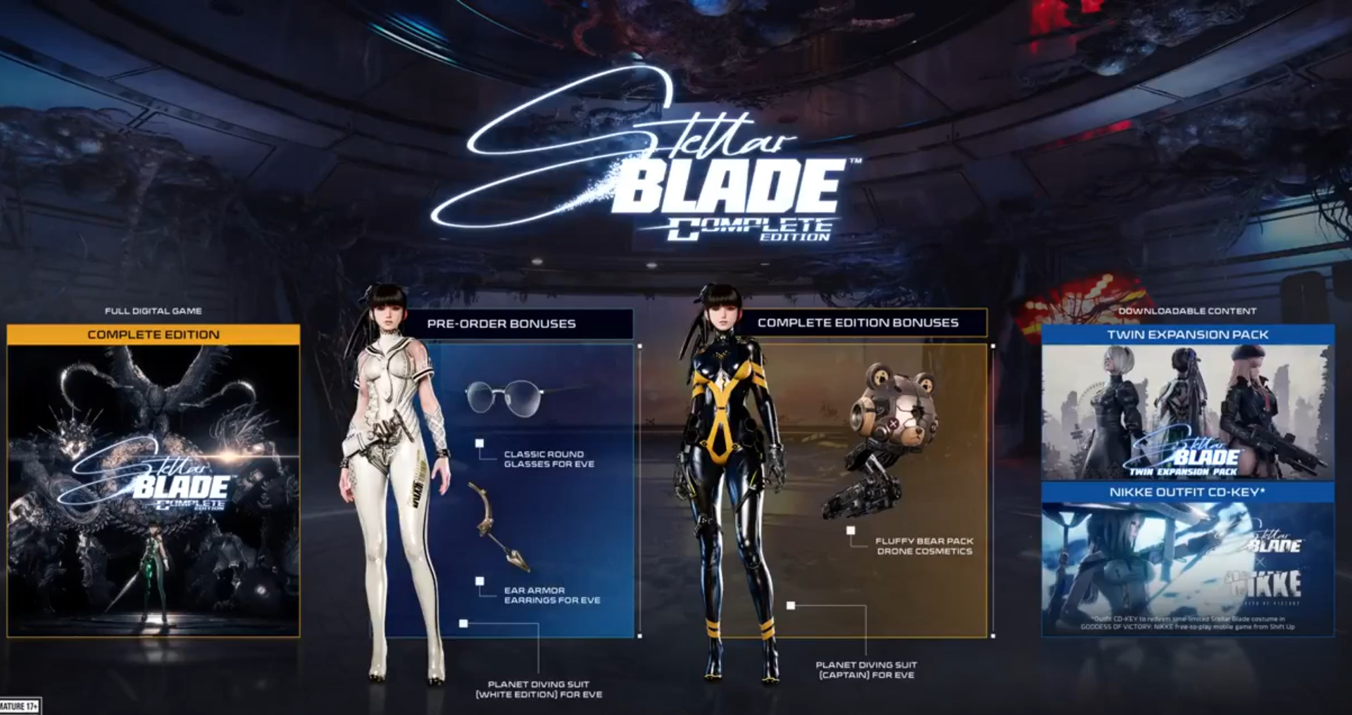 Co jednak w nim nowego? Przede wszystkim poznaliśmy datę premiery gry na PC — 11 czerwca, ale to nie wszystko! Okazuje się, że dokładnie tego samego dnia zarówno na PS5 jak i na PC zawita specjalna edycja gry — Stellar Blade Complete Edition. W jej skład wejdą wszystkie obecne dodatki, czyli dwa mini DLC, seksowny strój "Pani Kapitan" oraz specjalna skórka na naszego robocika. Na deser pozostają kosmetyczne bonusy za preorder w postaci złotych kolczyków oraz okularów.