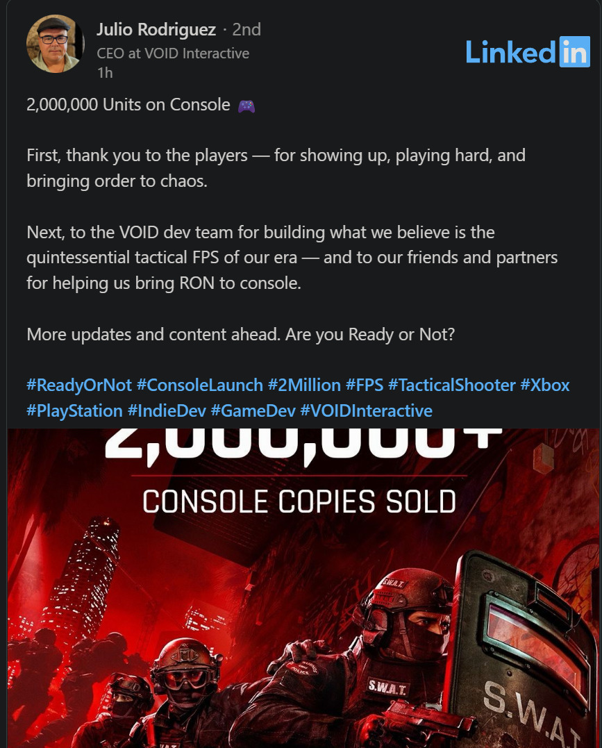 Mijają tygodnie od premiery przebojowej taktycznej strzelanki Ready or Not na konsolach, a sprzedaż nie chce zwalniać! Szef studia VOID Interactive, czyli producentów gry, ogłosił właśnie w serwisie LinkedIn, że pokonano kolejną barierę. Sprzedano 2 miliony sztuk gry w jedynie 2 tygodnie, co zasługuje na uznanie!