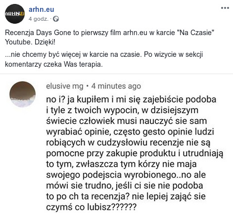 Dzisiaj, standardowo przegrzebując sieć szukając nowinek o grach, natknąłem się na facebooku na taki wpis kanału arhn.eu dotyczący recenzji Days Gone: