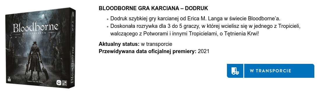 Pierwsza z nich, to dodruk Bloodborne Gra Karciana, z którą niestety mam ten problem, że jest to gra dla 3 - 5 graczy, więc bez zaproszenia jakiegoś znajomego w domowych warunkach może być ciężko o sposobność do gry.