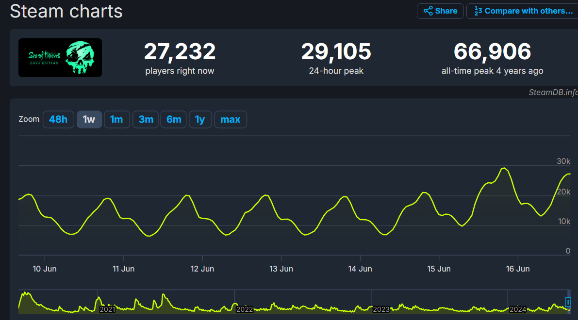 Mamy 2024 rok, a gra studia Rare regularnie utrzymuje się na powierzchni rankingów Steam, czy to pod względem sprzedaży, czy pod względem ilości graczy online.