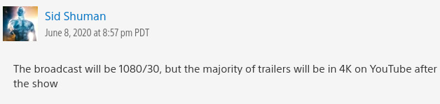 Wygląda jednak, że to faktycznie tylko jakieś ograniczenie techniczne i zapewne materiały między trailerami (wypowiedzi twórców) z powodu epidemii nie mogły zostać nagrane czasem nawet w porządnym HD, dlatego wybrano akurat takie rozwiązanie. Zaraz bowiem po ponad godzinnej prezentacji, na kanałach PlayStation zobaczymy te same trailery jako osobne filmy 4K, zatem około 23:00 w czwartek czeka nas powtórka z rozrywki i oglądanie trailerów w pełnej krasie. Ciekawe ile z nich będzie też w 60FPS?