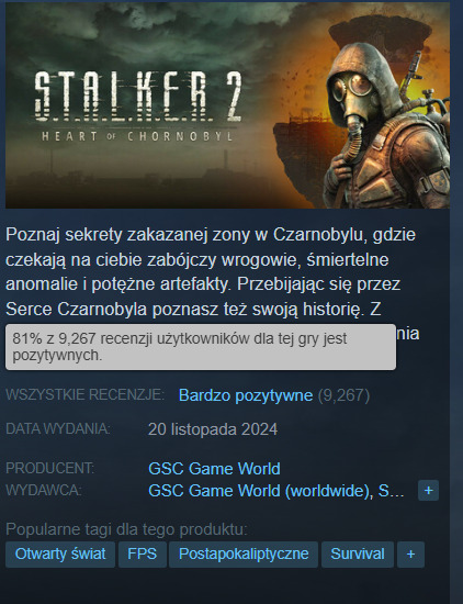 W dniu premiery ponad 113 tysięcy graczy bawiło się jednocześnie na Steam. To wynik, który plasuje Stalker 2 w top 10 najchętniej granych gier na tej platformie. Dla porównania, niedawna premiera Dragon Age: The Veilguard osiągnęła 89 tysięcy graczy w szczytowym momencie.
