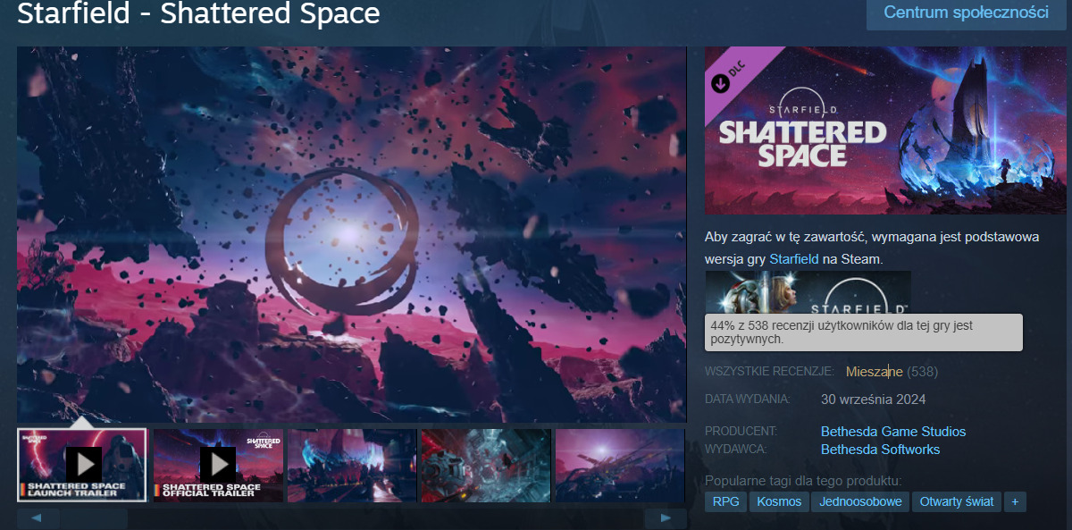 Rozszerzenie fabularne do najnowszej gry Bethesdy nie skradło serc graczy, a przynajmniej nie na platformie Valve. Starfield - Shattered Space zbiera mieszane opinie na Steam, a jedynie 44% opinii na tej platformie jest pozytywnych.