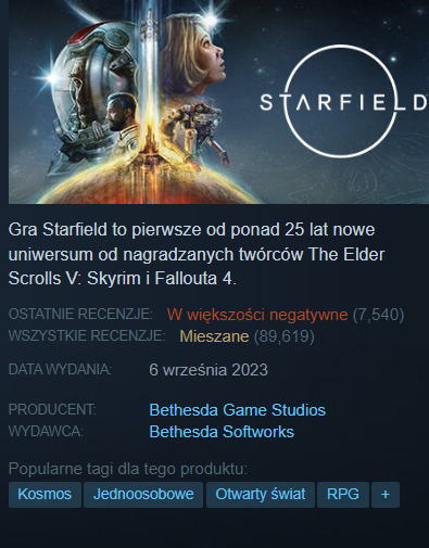 Wydawać by się mogło, że Starfield jest grą, która dzieli opinie graczy. Z jednej strony, otrzymała prestiżową nagrodę "Najbardziej innowacyjnej rozgrywki" w plebiscycie Steam, który opiera się na głosach użytkowników. Z drugiej strony, na tej samej platformie, Starfield ma obecnie średnią ocenę "mieszaną", a ostatnio nawet "w większości negatywną".
