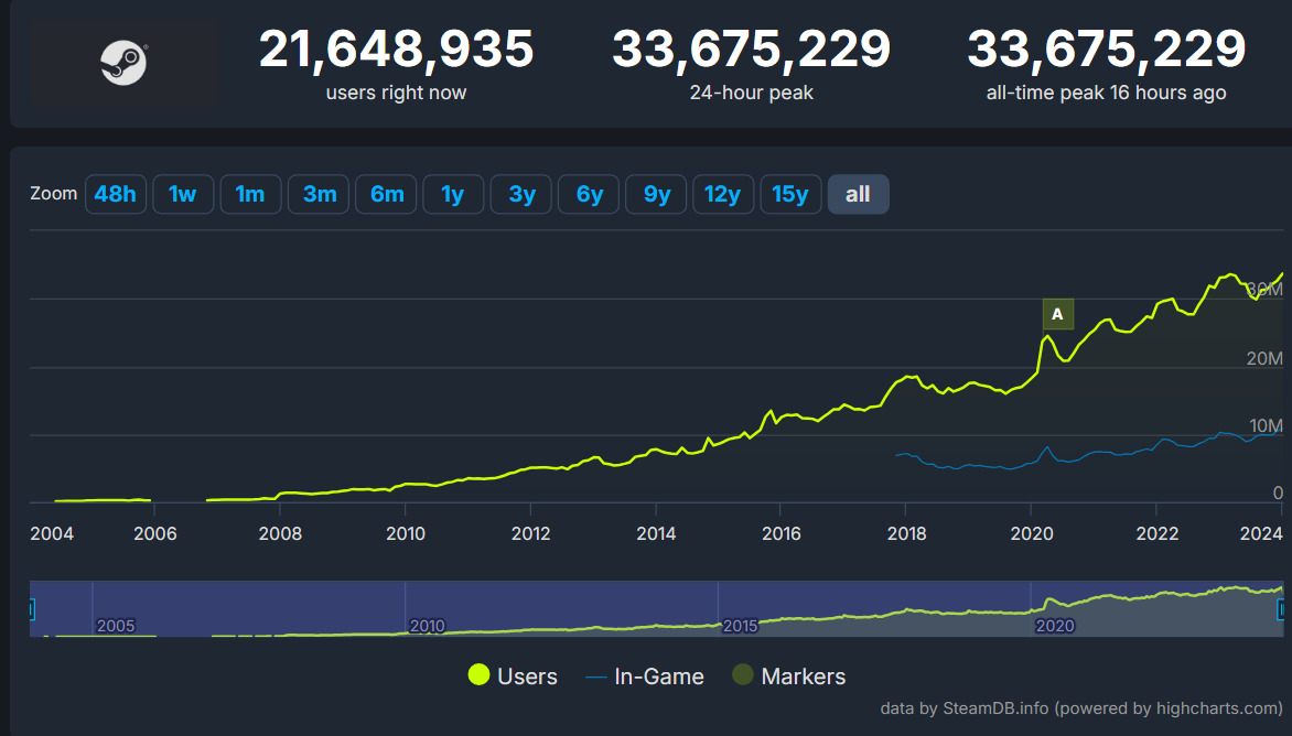 Mimo że niektórzy gracze uważają, że PC jako platforma do gier jest na wymarciu, to dane z cyfrowego sklepu STEAM pokazują coś zupełnie innego. Według najnowszych statystyk liczba użytkowników STEAM osiągnęła rekordowy poziom w grudniu 2023 roku, przekraczając 33 miliony aktywnych graczy jednocześnie!