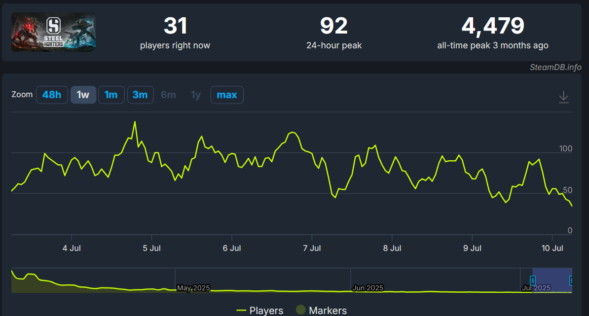 Gra spotkała się z mieszanymi opiniami graczy ( zaledwie 57% pozytywnych opinii ) i szybkim odpływem graczy. Obecnie w Steel Hunters gra 31 graczy.