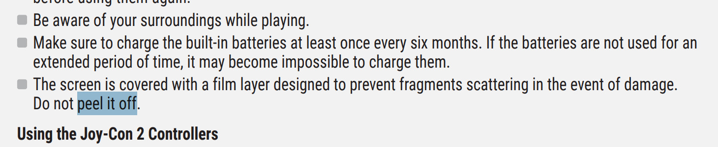 Do premiery Nintendo Switch 2 zostało zaledwie kilka dni. Miliony konsol zostały już wysłąne do sklepów, a kurierzy przygotowują się na prawdziwe piekło w czwartek, gdy konsola zostanie wysłana do nabywców. Tymczasem Japończycy po cichu ujawnili coś, co powinno być wiadome od miesięcy. Zuploadowano instrukcję obsługi konsoli , gdzie znalazł się zapis mówiący o tym, że jest ona wyposażona w fabryczną ochronę ekranu.