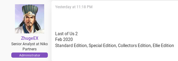 Informator ZhugeEX, zweryfikowany na forum Resetery jako analityk w Niko Partners (a więc może ale nie musi znać prawdy, jak to analityk), zapowiedział, że gra wyjdzie w lutym w czterech wersjach do wyboru. Wróżeniem z fusów bym tego nie nazwał, bo Sony od lat już wypuszcza swoje hity właśnie w okresie luty-marzec (Killzone, God of War, Horizon), czy wrzesień-listopad (Uncharted, Spider-Man). Od siebie dodam, że trailer gry z datą premiery zobaczymy albo na grudniowym PSX (o ile się odbędzie), albo na Video Game Awards (też początek grudnia). Po tym jak CDPRed zapowiedział Cyberpunka na kwiecień, a FF VII Remake wyląduje w marcu, luty wydaje się ostatnim sensownym okienkiem dla tej gry (a dla Ghost of Tsushima maj-czerwiec).