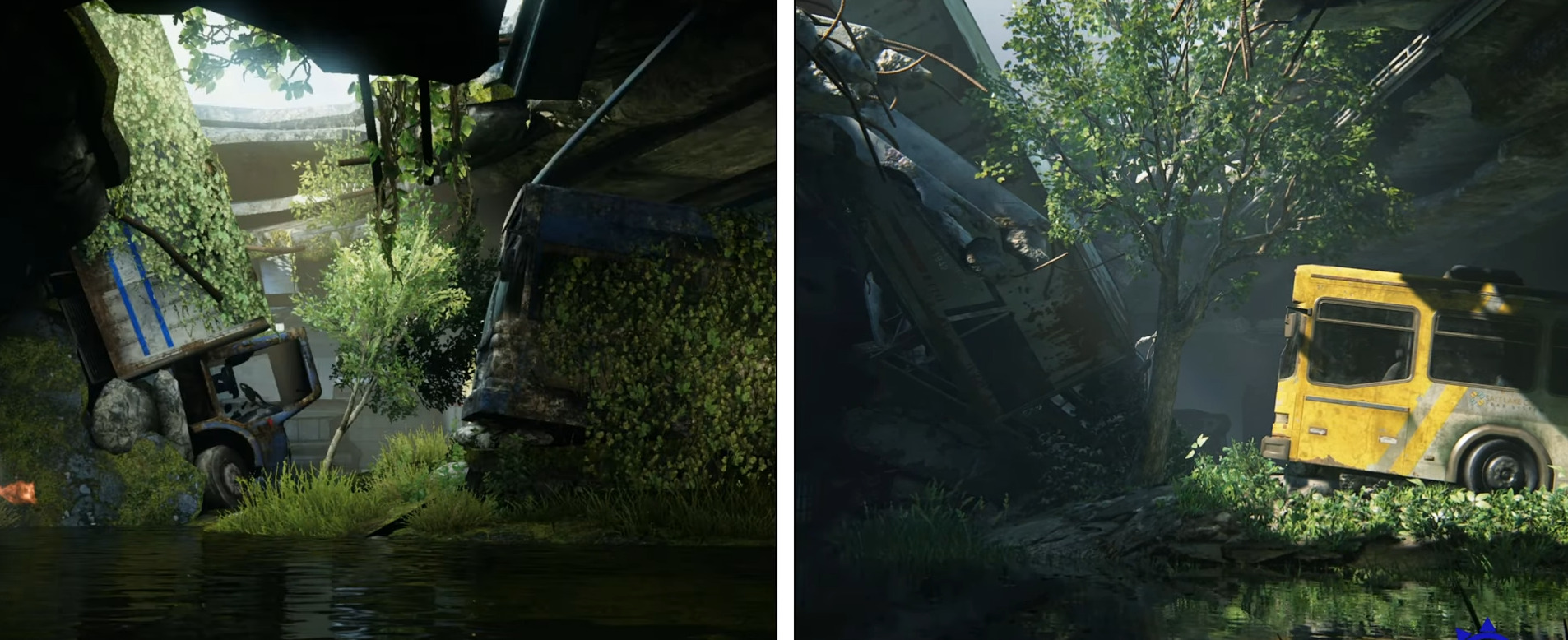 Największe jednak zmiany przeszły areny. Niektóre są nie do poznania, bo zmieniono wszystko. Ot chociażby sekwencja w centrum handlowym (jeśli mnie pamięć nie myli z dodatku Left Behind), gdzie sklepy wyglądały jakby je ktoś opuścił raptem tydzień temu, teraz zmieniają się w totalnie zdemolowane i zabite deskami. W wielu sekwencjach w mieście, pojawiają się totalnie nowe budynki w miejsce starych, aby urozmaicić otoczenie. Widać też poprawy tekstur na powierzchniach budowli - to co kiedyś pokrywał tynk, teraz mogą pokrywać cegły z pełnym bump mappingiem, wyglądając tak, jakby ktoś wstawiał je po pijaku bo każda jest w inną stronę. Z kolei wnętrza dużych budynków mają przemodelowane gzymsy czy filary, a nawet witraże, tak, że dopiero teraz widać, jak sporo minęło od ery PS3.