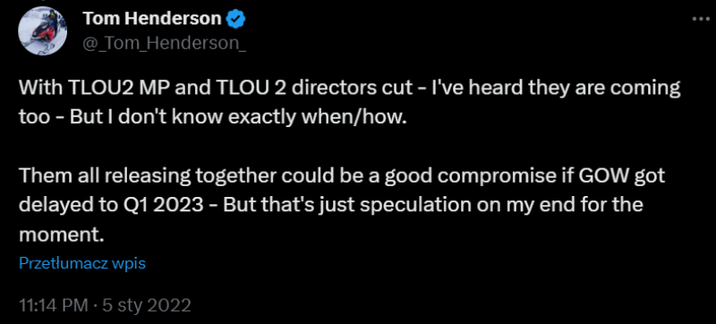 Warto zaznaczyć, że nie jest to pierwszy raz kiedy sprawdzone źródła informują o przygotowaniu nowej wersji gry roku 2020. Jeszcze w 2022 Tom Hendersson poinformował, że trwają pracę nad The Last of Us: Part 2 Director's Cut. W temacie wypowiedział się również Gustavo Santaolalla, kompozytor ścieżki dźwiękowej serii, który w lipcu zasugerował, że w nowej edycji gracze będą mogli poprosić bohatera z gry o zagranie kilku jego utworów.