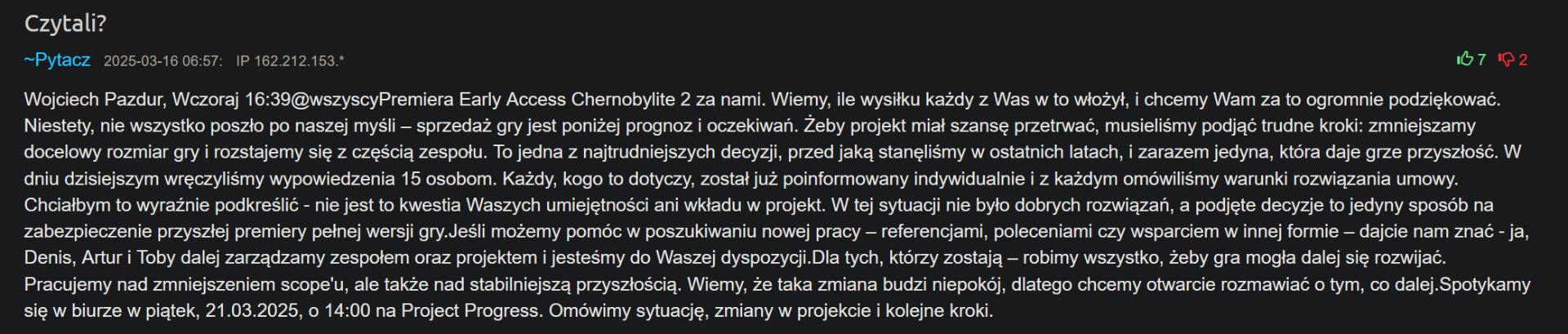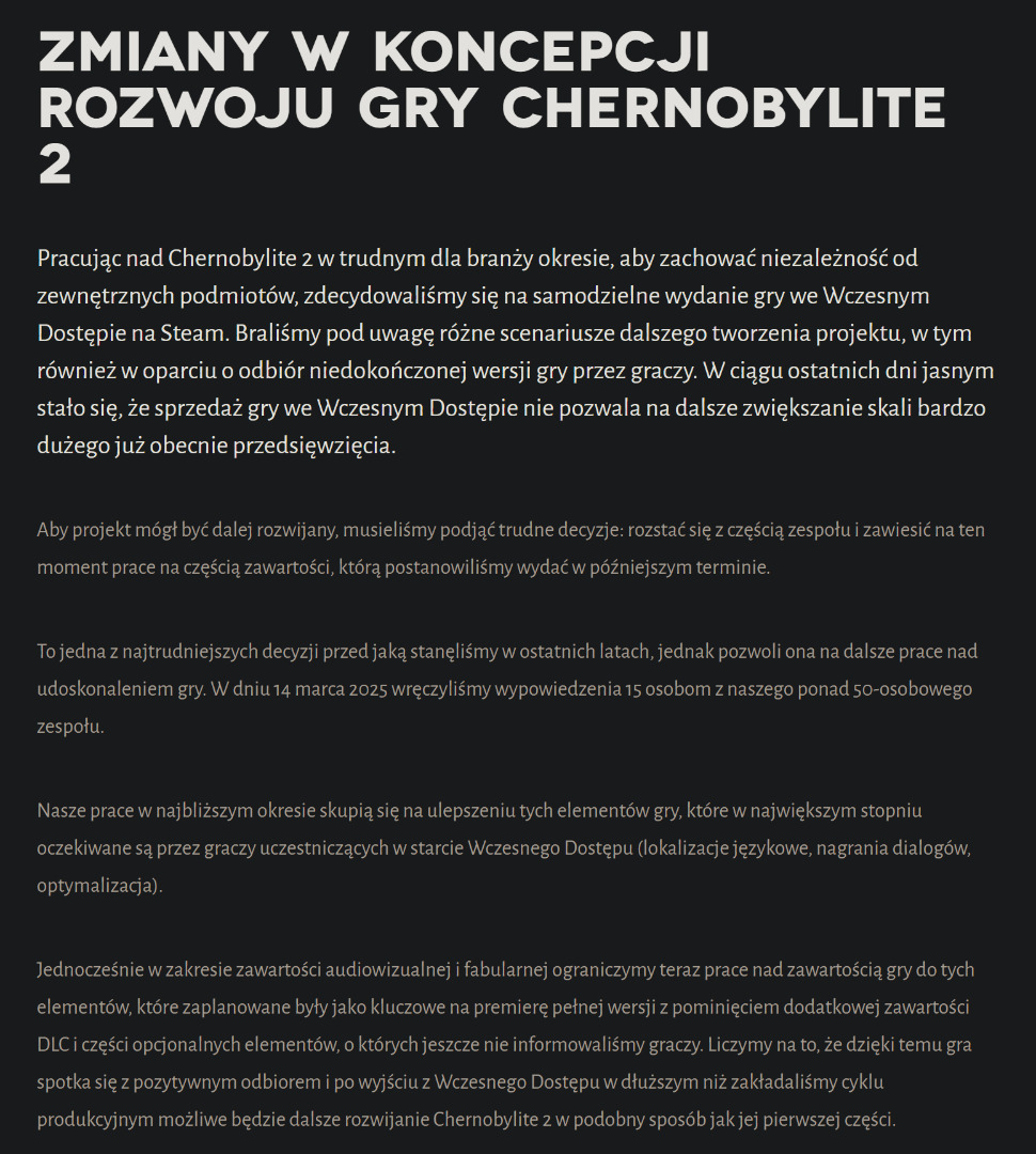 Włodarze firmy oczywiście wiedzą, że sytuacja jest niewesoła i choć oficjalnego komunikatu na moment pisania tego artykułu jeszcze nie ma, to dwa źródła twierdzą, że przez katastrofę Early Accessu Chernobylite 2 z pracą w Farm 51 ma pożegnać się 15 osób. Informację potwierdził także cytowany jeszcze wczoraj przez nas Filip Chrzuszcz, który niedawno przeprowadzał śledztwo w sprawie nieuczciwych studiów Iron Lung i Mighty Koi. Informację możemy wiec praktycznie brać za pewniak.