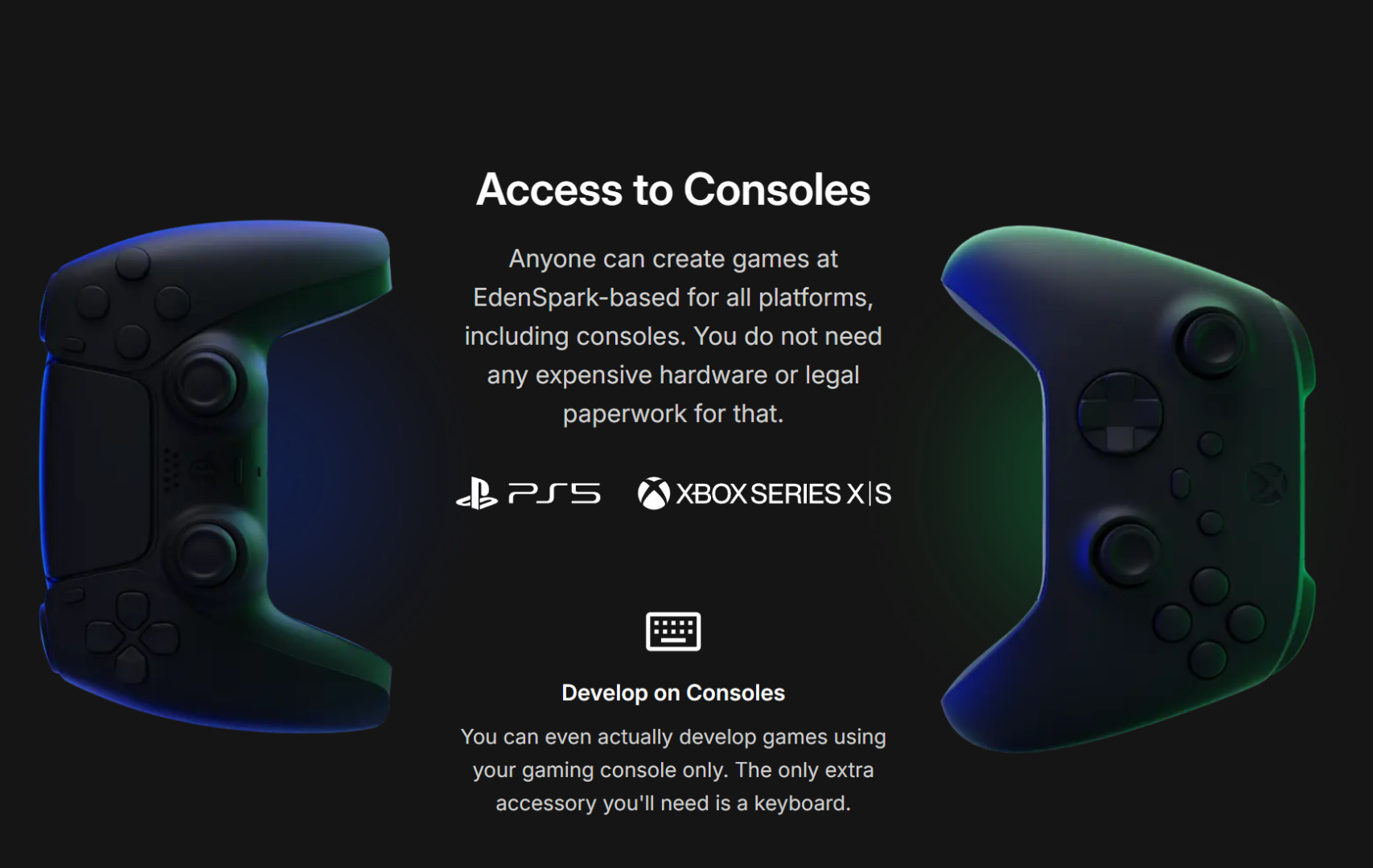 EdenSpark ma być pierwszą otwartoźródłową platformą pozwalającym twórcom gier na łatwe udostępnianie swoich gier na konsole bez potrzeby rejestrowania firmy, czy wykonywania kosztownych czynności prawnych. Teraz nawet osoby prywatne będą mogły łatwo przeportować grę na Xbox, czy PlayStation . Co więcej nowy silnik gwarantuje im także pełne prawa do swoich dzieł.