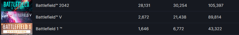 Wyjątkowy brak szczęścia ma najnowsza produkcja DICE. Nie minęły jeszcze dobrze dwa tygodnie od premiery, a gra już ma spore spadki zainteresowania. Oczywiście nie jest łatwo zauważyć to na konsolach, które nie publikują oficjalnych statystyk, ale już Steam w wersji na PC, gdzie grę można było kupić (poza platformą Origin od EA) pokazuje zatrważający spadek - podczas gdy w dniu premiery w szczycie grało ponad 100.000 graczy, 14 dni później gra lewo dobija do 30.000 (dziś 30.356). Co gorsza, widać ewidentny trend spadkowy o kilka tysięcy osób dziennie, można więc zakładać, że i na innych platformach nie jest lepiej. Najciekawsze jest to, że jeśli trend się utrzyma, po weekendzie w Battlefield 2042 będzie grać mniej osób niż w Battlefielda V...