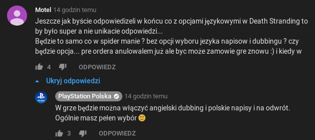 Dowiedzieliśmy się niedawno, że Death Stranding dostanie pełen polski dubbing, ale to zaczęło rodzić pytania w drugą stronę - czasem tak duże gry (DS ma zająć 55+GB), ze względu na limit miejsca nie mają opcji zmiany języka i kupując grę w naszym kraju, skazani jesteśmy na jedynie polskie głosy. Nie wszyscy są fanami dubbingu - niektórzy dla tego, że aktorzy potrafią grać zbyt teatralnie, inni dla tego, że często głośność jest nierówna (ja dlatego gram z polskimi napisami...), a niektórzy po prostu wolą szlifować angielski czy też posłuchać oryginalnych, znanych aktorów (których w DS nie brakuje). Na swoim kanale youtube, w jednym z komentarzy, Sony Polska poinformowało, że nie ma się co martwić - będzie można szaleć z kombinacjami polskie/angielskie napisy/głosy. To bardzo dobra wiadomość, bo na pewno uspokoi wielu graczy i nie będzie narzekań na ten element, bo odwieczna wojna polski vs angielski jest równie zacięta jak Xbox vs PlayStation.