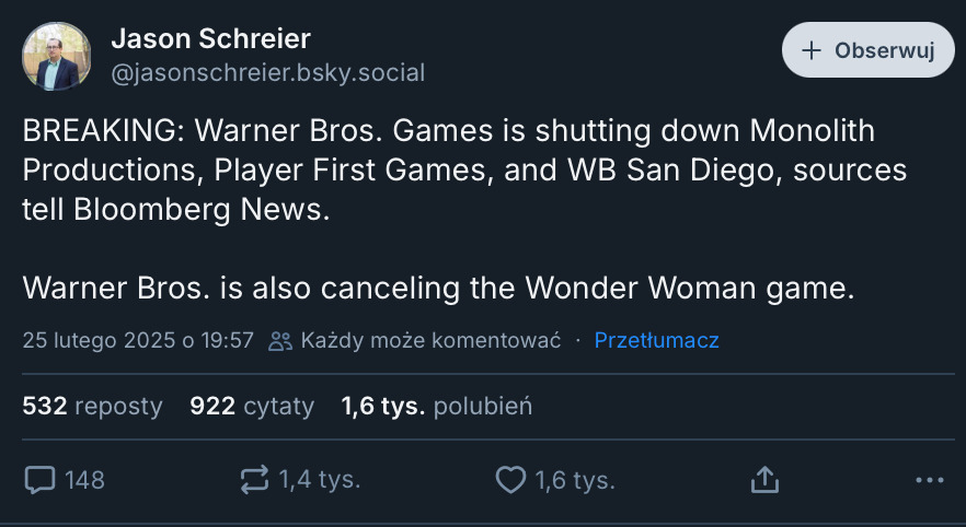 Zawsze szkoda gdy tak zasłużone studio Monolith jest zamykane. Co do gry z Wonder Women to niespecjalnie żałuje, bo na nia nie czekałe. Superbohaterowie to nie za bardzo moja bajka.