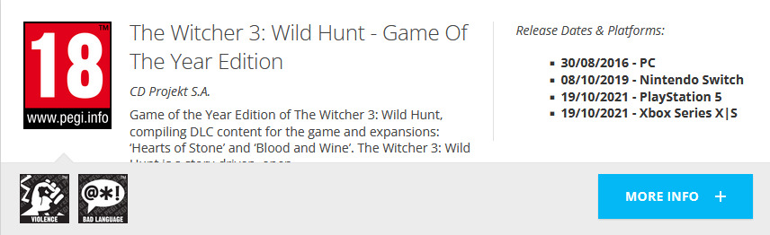 Jest jednak pewna jaskółka nadziei, bowiem rzeczone wersje zostały dziś dopisanie na stronie PEGI, zajmującej się klasyfikacją gier, do wydanych już na PC i Switcha wersji Game of the Year (wersje na PS4 i Xboxa One nie wiedzieć czemu są osobnymi pozycjami). Można by zakładać, że premiera tuż tuż, bowiem gry trafiają do PEGI zazwyczaj na ostatniej prostej (w momencie gdy są wystarczająco grywalne i nie nastąpią już zmiany w zawartości), problem polega jednak na tym, że w sumie Wiedźmin 3 poza nowymi DLC nowej zawartości i tak mieć nie będzie.
