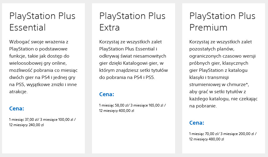 Cena za rok - 400zł (3 miesiące za 165zł i 1 miesiąc za 58zł). Pakiet zawiera PS+ Essential (zatem jest o 160zł droższy)