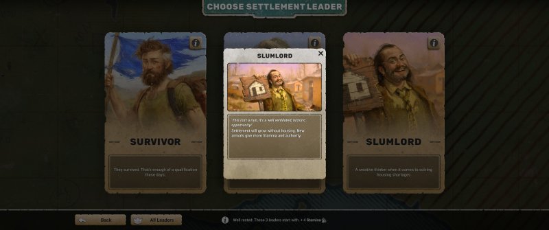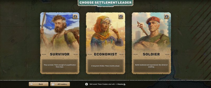 Kolejną kwestią są liderzy, których możemy wybrać w ramach konkretnej mapy. Najbardziej podstawowym jest „Survivor”, którego jedyną zaletą jest brak wad – najzwyklejsza postać, która niczym się nie wyróżnia i nie gwarantuje nam żadnych dodatków. Na szczęście są jeszcze inne jednostki ludzkie, których szczególne cechy mogą nam znacząco ułatwić (lub utrudnić) rozgrywkę.