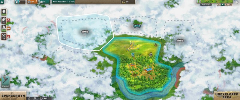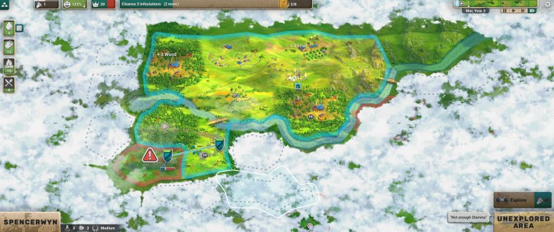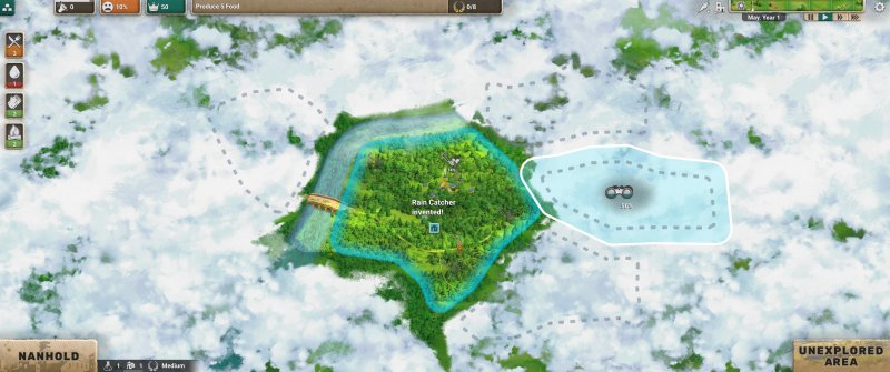 Po wybudowaniu osady dobrze byłoby rozpocząć eksplorację, ponieważ na początku widzimy jedynie drobny fragment mapy. Cała reszta jest za mgłą, która rozrzedza się dopiero po tym, jak przeprowadzimy rekonesans konkretnego miejsca. Następnie możemy je albo przejąć, albo przejść do sprawdzania kolejnego kafelka.