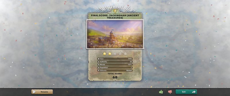 Ta ostatnia jest szczególnie ciekawa, ponieważ standardowo zaczynamy z populacją o wartości 1 i sami musimy doprowadzić ją do najwyższej możliwej dla danej mapy lub do minimalnej wymaganej do osiągnięcia celu. Przeważnie mowa o populacji na poziomie 7, ale najwyższą cyferką, jaką kojarzę, jest bodajże 11. Co logiczne, im wyższa populacja, tym więcej zasobów zużywa, bo w końcu więcej mamy gęb do wykarmienia, ale też odpowiedni jej poziom wymagany jest do odblokowania poszczególnych elementów.