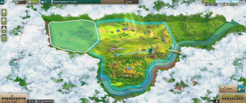 Żeby przejąć dany obszar, musi być on połączony z naszą osadą, co oznacza, że nie możemy wybierać poszczególnych kafelków spośród tych dostępnych na mapie. Jeżeli interesuje nas coś, co jest na drugim końcu planszy, to niestety, ale musimy przejąć wszystko po drodze. Przeważnie nie jest to wielki problem, choć „przeważnie” jest tutaj słowem kluczowym.