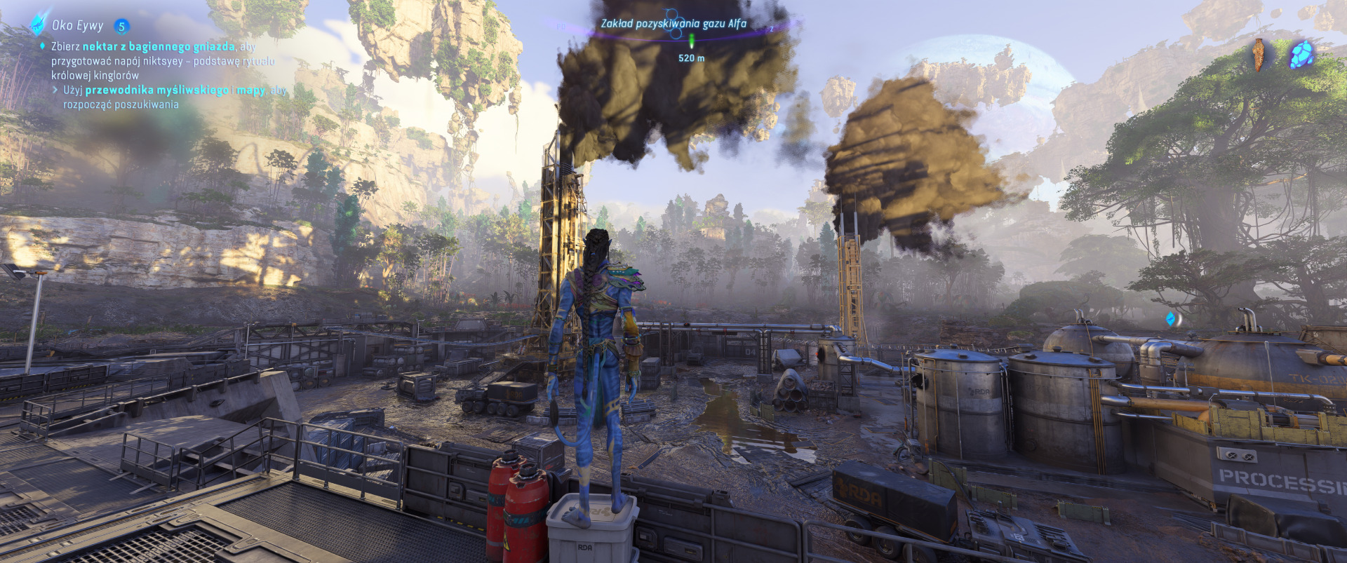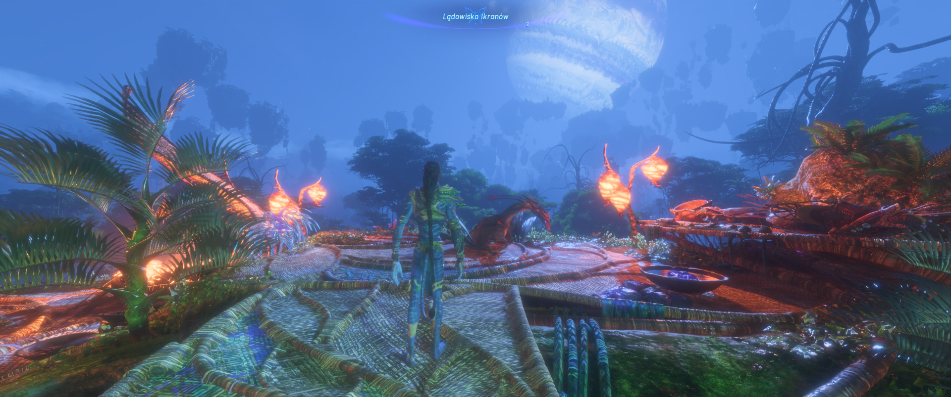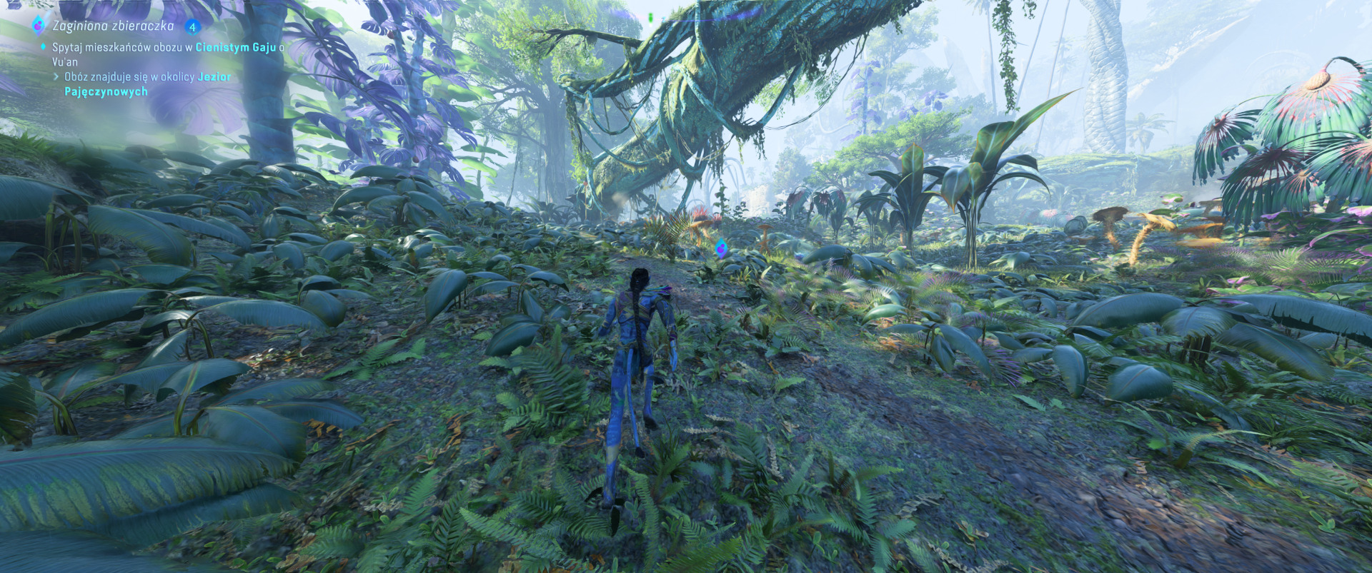 Kamera TPP to prawdziwy game changer w odbiorze Avatar: Frontiers of Pandora — mogę bronić tego zdania o każdej porze dnia. Dopiero teraz mamy szansę w pełni docenić ogrom pracy, jaką deweloperzy włożyli w to, aby jak najlepiej oddać elficką wręcz zwinność autochtonów z Pandory. Przemierzając pandorańskie dżungle, bagna i łąki w perspektywie trzeciej osoby bawię się wyśmienicie, ale nie można nazwać obecnej implementacji nowej perspektywy idealną.
