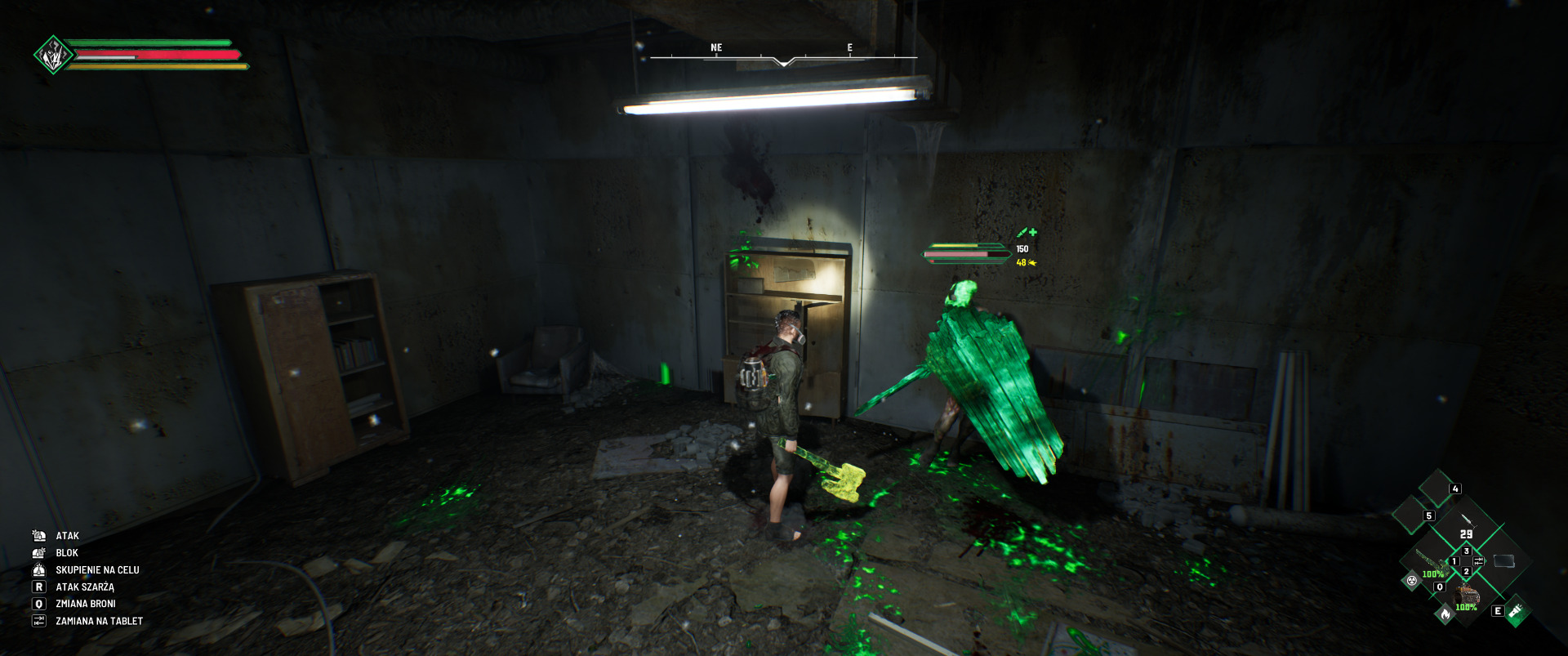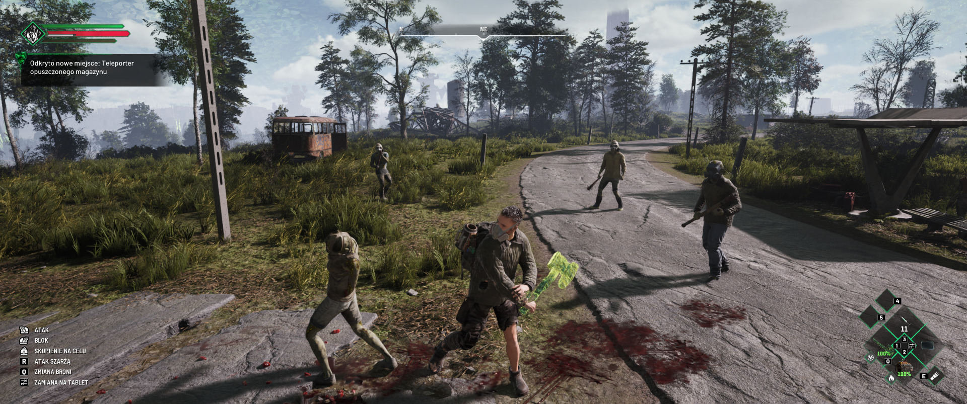 W Chernobylite 2: Exclusion Zone z wrogami radzić możemy sobie na kilka sposobów. Po pierwsze, i to z tego korzystałem najczęściej, walczyć możemy w zwarciu. Widok trzecioosobowy wykonany jest jedynie prawidłowo. Pozwala łatwo zorientować się w tym, co dzieje się wokół nas, ale postać nie jest zbyt responsywna, a animacje kolejnych ciosów nie dają frajdy. Nie czuć siły naszych uderzeń nawet wtedy, gdy oburącz ściskamy olbrzymi kawał żelaza. Nie brzmię zbyt entuzjastycznie, ale to nie jest najgorszy system walki z jakim miałem do czynienia. Gdybym miał go do czegoś porównać, to najbliżej mu do drugiego Elexa. Jak widać, twórcy wzięli sobie do serca więcej dzieł Piranii, aniżeli samego Gothica.