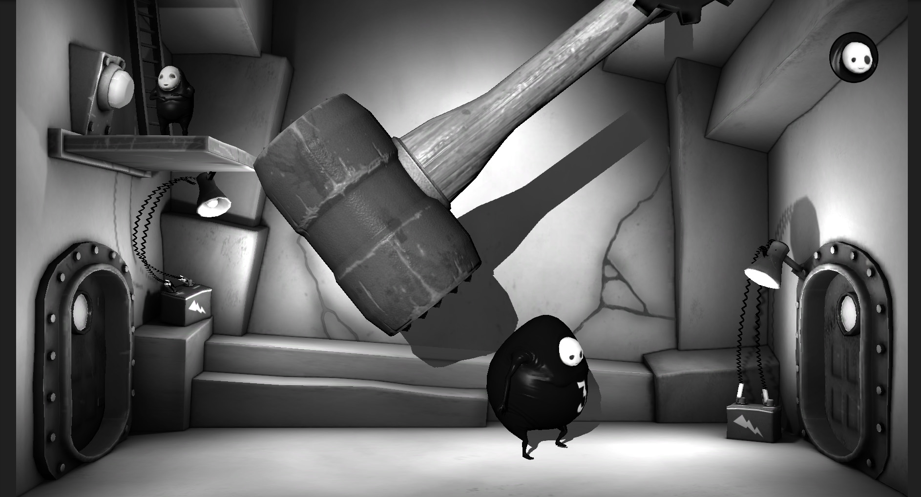 Poznajcie Mała i Duuża, dwóch bohaterów przygody, która rozpoczyna się w fabryce Ponurra. Mieli oni być jedynie kolejnymi sługusami i świnkami morskimi złego nikczemnika, jednak dzięki pewnemu zbiegowi okoliczności Mał uwalnia się z swojej klatki i uwalnia przy tym swojego kompana. Bardzo spodobało mi się na starcie to, jak zostały dobrane imiona, które idealnie oddają naturę obydwóch postaci. Dwójka ta jest swoistym Flipem i Flapem świata gier, gdzie Mał jest malutki, zaś Duuż to ogromniasty koleś, którego łatwiej przeskoczyć, niż obejść. Obydwaj muszą pokonać masę przeszkód, zanim uciekną z szponów Ponurra i będą cieszyć się wolnością.