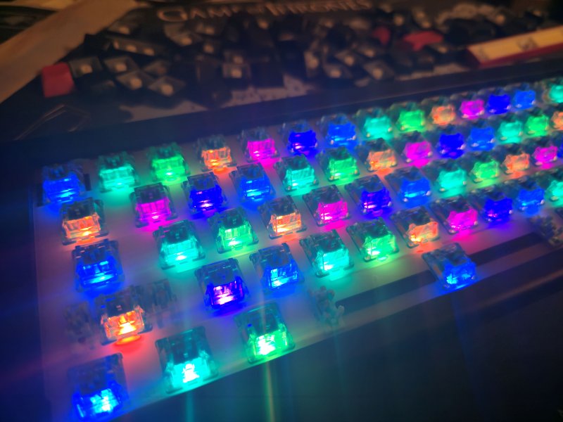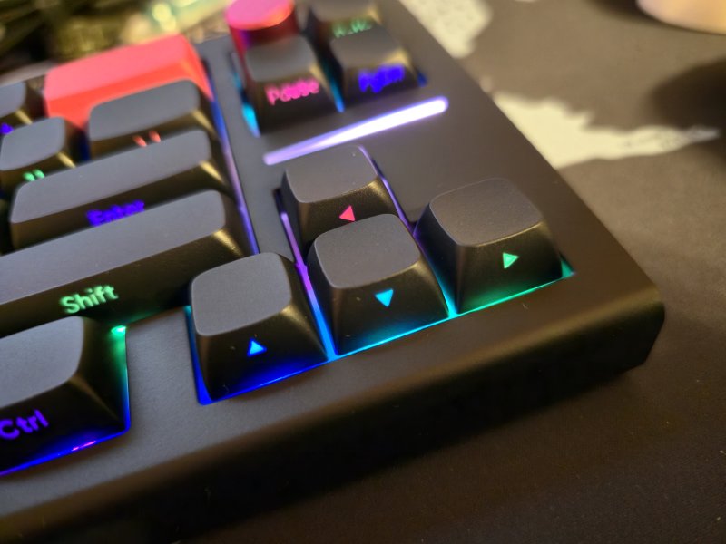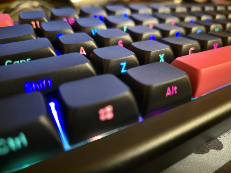 Jak już poruszyłem temat RGB, to jest ono dość dobrej jakości, choć mogłoby być jaśniejsze. Barwy są całkiem intensywne, a same kolory ułatwiają namierzenie poszczególnych klawiszy. Bez nich, w nieco słabiej oświetlonym pomieszczeniu, klawiatura może bowiem wydawać się pozbawiona jakichkolwiek nadruków na przyciskach. Jak jednak wspomniałem wyżej, da się do tego względnie bezproblemowo przyzwyczaić.