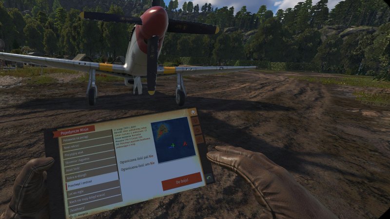 Po założeniu gogli i uruchomieniu gry, jesteśmy od razu wrzuceni na pas startowy z tekturowym menu w ręce, mającym przypominać taktyczną lotniczą mapę. Widzimy możliwe do wyboru maszyny spośród kilku obecnych w grze nacji oraz dostępne tryby rozgrywki.