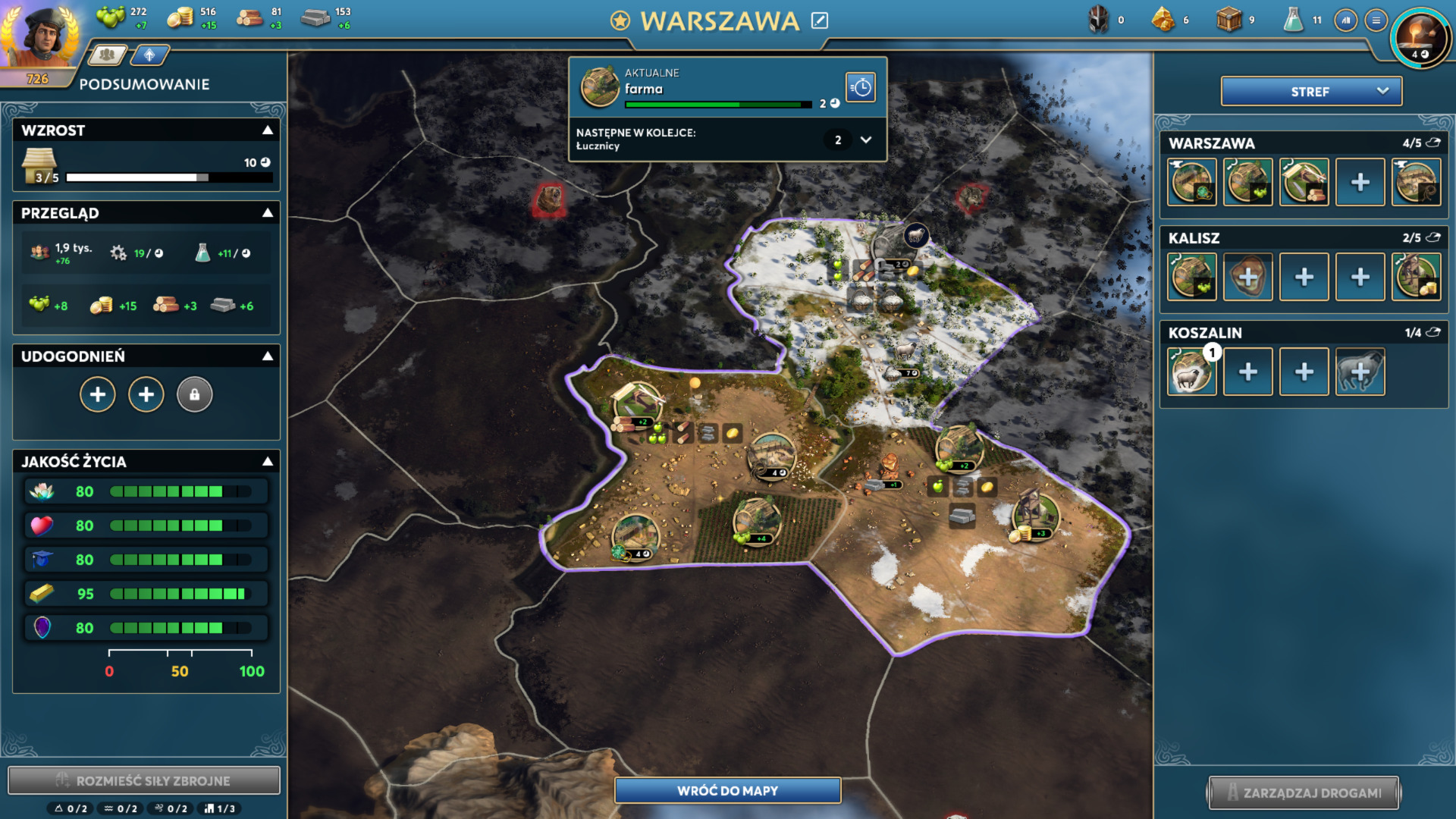 Każde narzędzie jest do czegoś potrzebne, a każdy budynek można usprawnić dzięki wytworzonemu wcześniej przedmiotowi. Skala ulepszeń i bonusów może przerażać, ale interfejs gry jest na tyle czytelny, że nie stanowi to dla gracza aż tak czasochłonnego zajęcia. Choć opis może trochę zniechęcać do tego systemu, ja zaliczam go do plusów gry. Mechanika ta sprawia, że jesteśmy w stanie stworzyć naprawdę dobrze funkcjonujące państwo, którego miasta dopełniają się w każdym aspekcie. Dzięki temu gra jest angażująca praktycznie od początku do samego końca!