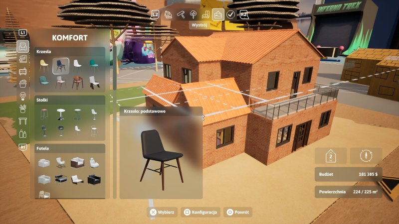 Interfejs i sterowanie, przynajmniej na konsoli wypadają strasznie nieintuicyjnie i wielokrotnie musiałem przeklikiwać się przez przyciski szukając konkretnej opcji. Część narzędzi nie działa tak, jak powinna, z czego wymienić można, chociażby przyciąganie, które nie pozwala logicznie postawić mebli, a w szczególności krzeseł. Z drugiej strony, jeśli wyłączymy tę opcję, to wszystkie przedmioty będą umieszczane krzywo, nie dając możliwości dostosowania ich do siatki. Ścian, przykładowo, nie można usuwać w trybie wystroju, więc przy ewentualnych zmianach musimy skakać przez trzy kolejne kafelki. Budowanie również posiada mnóstwo ograniczeń. Nie ma wielu standardowych opcji, które znajdziemy w innych grach tego typu.